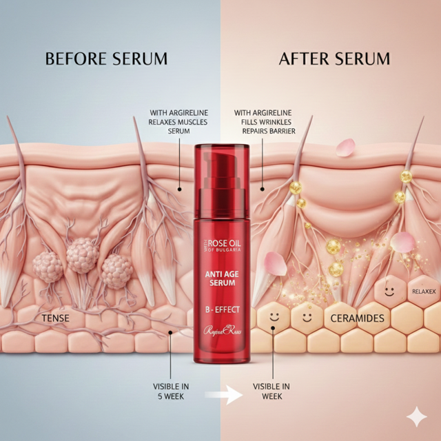 En resumen: El sérum busca transformar una piel con arrugas y pérdida de firmeza, en un rostro con arrugas atenuadas, volumen restaurado y un aspecto más liso, joven y relajado, gracias a su complejo bio-activo patentado con Argireline® y aceite de Rosa Damascena.