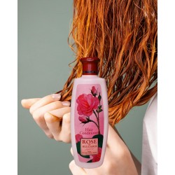 Sin Parabenes. Especialmente elaborado con un componente único: el Agua natural de Rosa Damascena. Contiene un alto contenido de éteres de aceite de rosa, que, combinado con extractos nutritivos y vitaminas, garantiza el vigor y la belleza de su cabello. El beneficioso aceite de Jojoba y el extracto de Manzanilla hidratan profundamente el cabello seco y dañado, volviéndolo sedoso, suave, brillante y de fácil manejo.