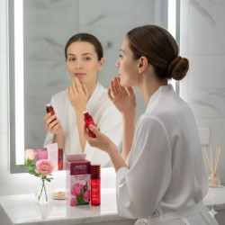 el aceite de rosa Damascena de Bulgaria contiene más de 200 sustancias preciosas que tienen efectos notables en el cuerpo humano y lo convierten en un elixir insustituible para la belleza. Con su fuerte efecto antiinflamatorio, regenerador y antibacteriano, el aceite de rosa Damascena Rose y el agua de rosas son agentes ideales para la limpieza, tonificación y humectación de la piel. Ayudan a mantener el equilibrio hidrolipídico de la piel y estimulan la regeneración de tejidos dañados y envejecidos. El aceite de Damascena Rose y el agua búlgaras también alivian y combaten la inflamación, poseen actividad antioxidante y retrasan la aparición de arrugas.